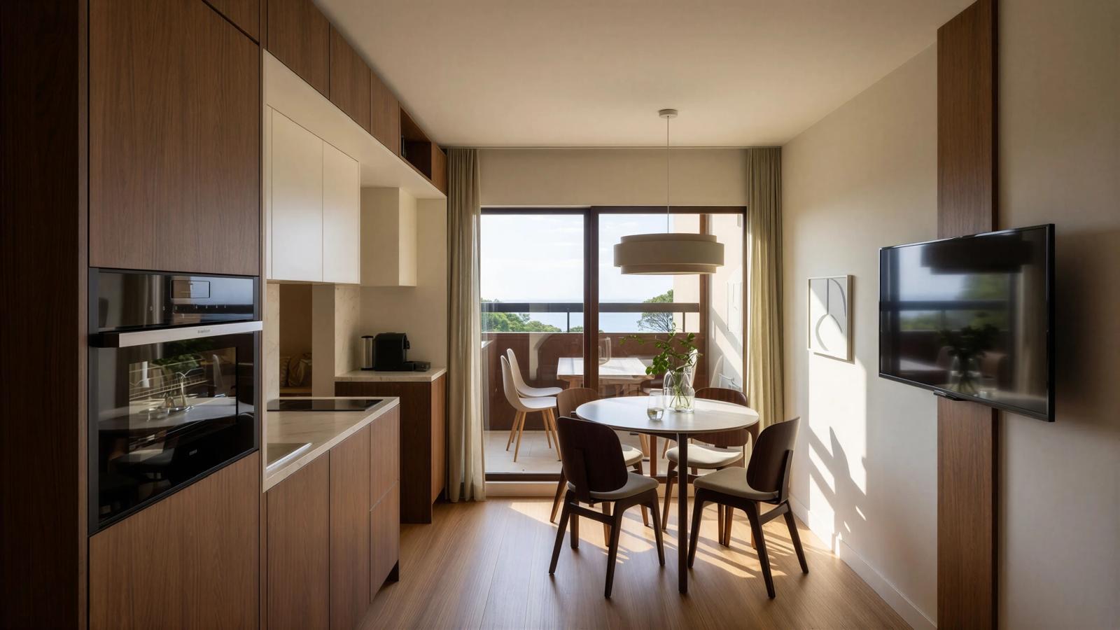 The living space is designed for comfort and ease, with a fully equipped kitchen, dining area and a cosy seating space. The apartment is efficiently laid out across 28 m², making the most of its size while offering a bright and open atmosphere. Large windows and sliding doors connect the interior with the terrace, allowing natural light throughout the day.
